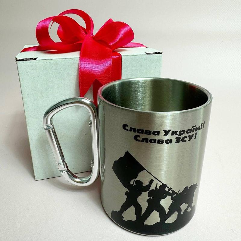 Кружка металева з карабіном "слава україні" 300 мл у подарунковій коробці з бантом