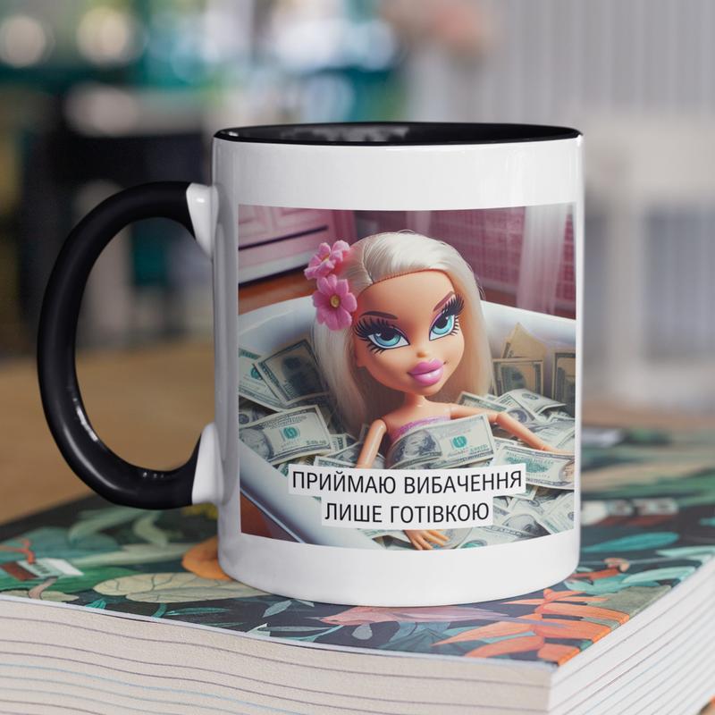 Чашка керамическая с принтом "принимаетизвинения только налички" 330 мл, белая с черной ру...
