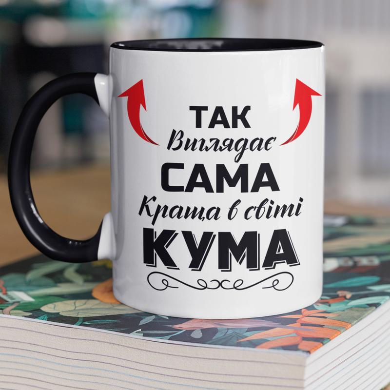 Чашка керамічна з принтом "так виглядає сама краща в світі кума" 330 мл, біла з чорною руч...