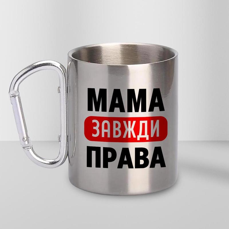Чашка металлическая с принтом "мама всегда правая" 300 мл с карабином, серебристая