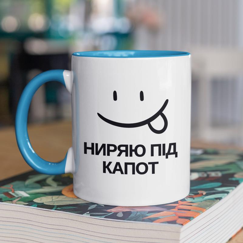 Чашка керамическая с принтом "солнышко под капот" 330 мл, белая с голубой ручкой