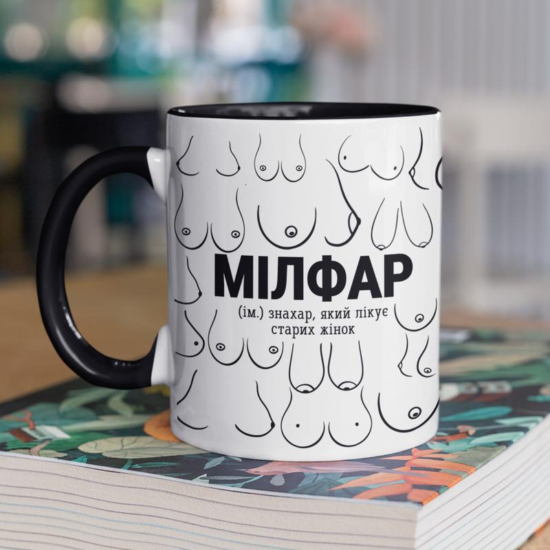 Чашка керамическая с принтом "милфар" 330 мл, белая с черной ручкой