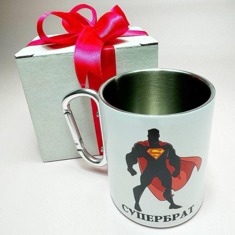 Кружка металлическая с карабином "супербрат" 300 мл в подарочной коробке с бантом
