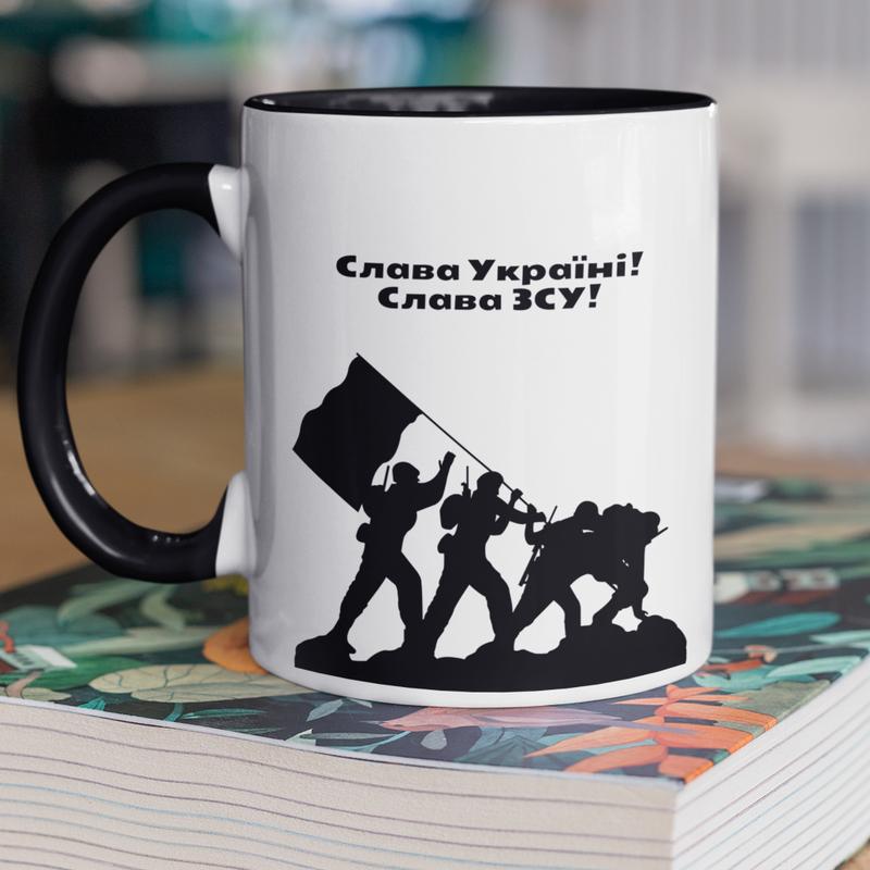 Чашка керамическая с принтом "слава украине" 330 мл, белая с черной ручкой