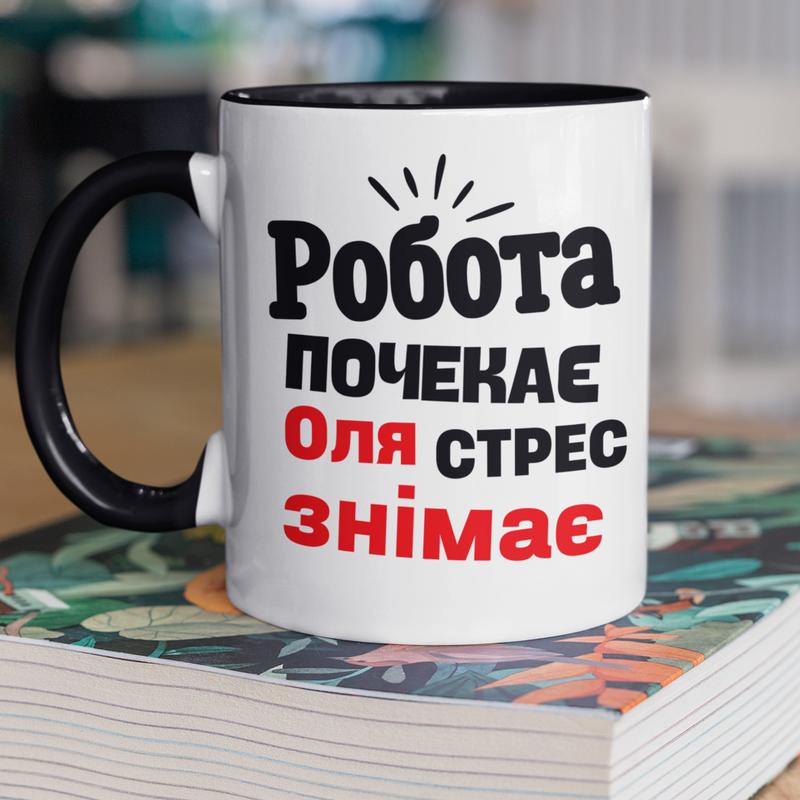 Чашка керамическая с принтом "оля стресс снимает" 330 мл, белая с черной ручкой