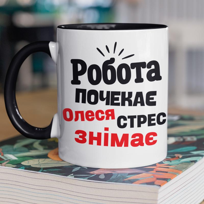 Чашка керамическая с принтом "олеся стресс снимает" 330 мл, белая с черной ручкой
