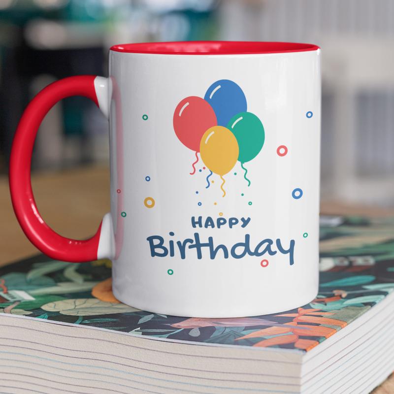 Чашка керамическая с принтом "happy birthday" 330 мл, белая с красной ручкой