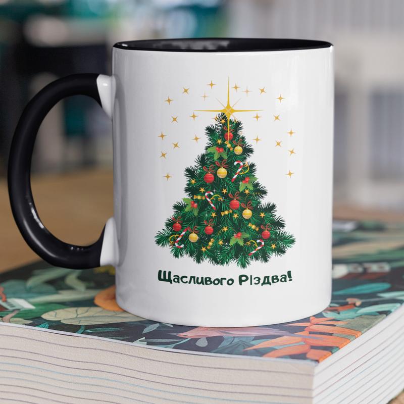 Чашка керамическая с принтом "счастливого рождества" 330 мл, белая с черной ручкой