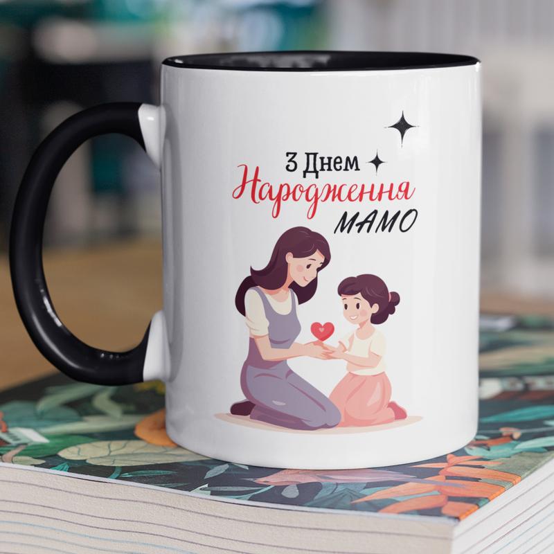 Чашка керамічна з принтом "з днем народження мамо" 330 мл, біла з чорною ручкою
