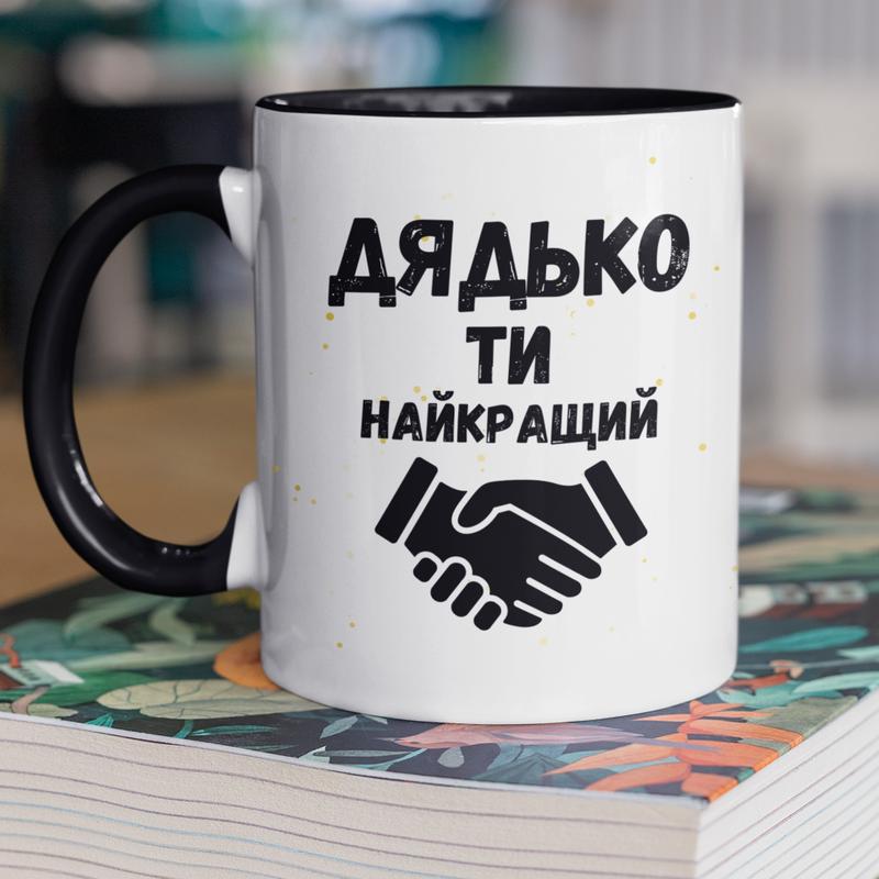 Чашка керамическая с принтом "дядько ты лучший" 330 мл, белая с черной ручкой