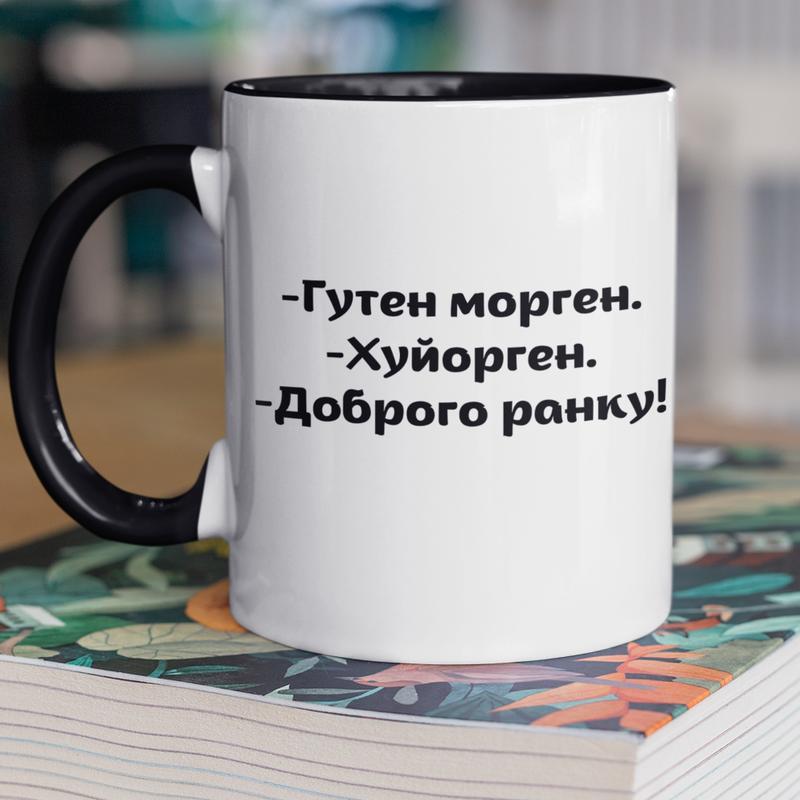 Чашка керамическая с принтом "гутен морген" 330 мл, белая с черной ручкой