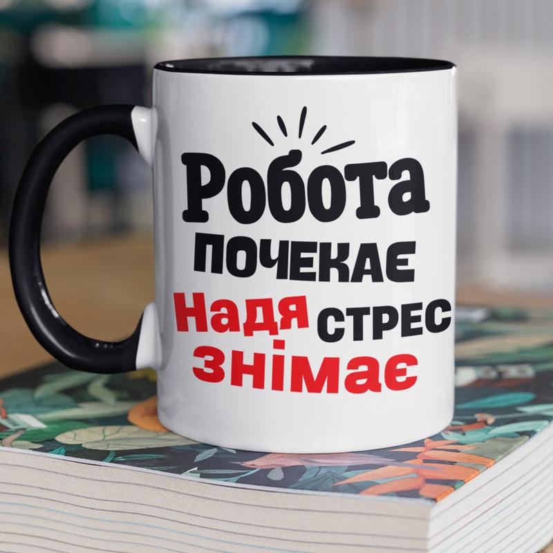 Чашка керамическая с принтом "надя стресс снимает" 330 мл, белая с черной ручкой