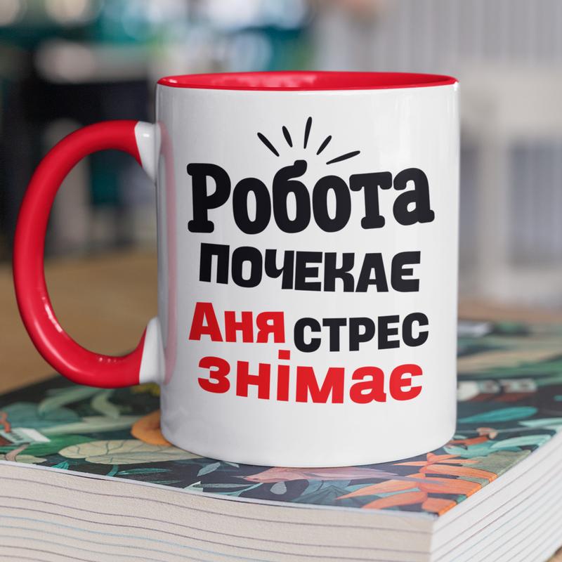 Чашка керамическая с принтом "аня стресс снимает" 330 мл, белая с красной ручкой