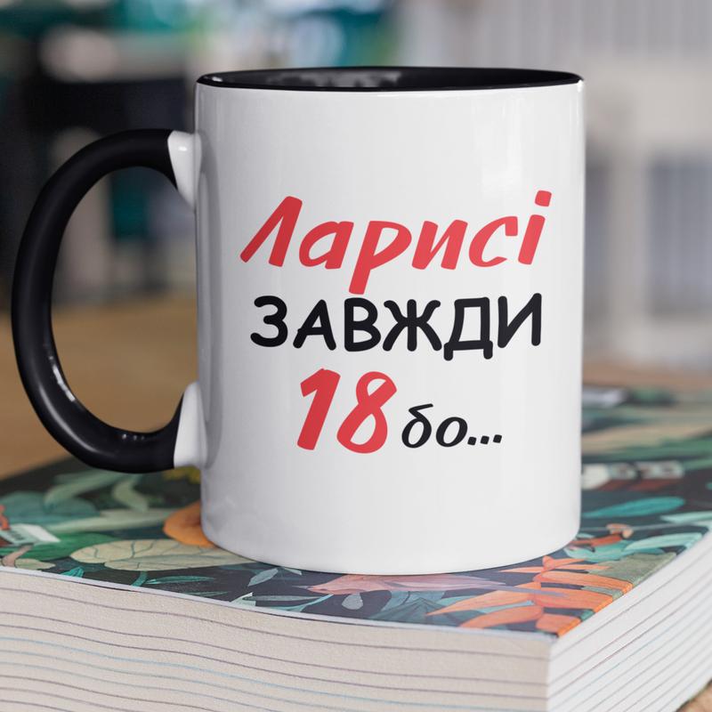 Чашка керамическая с принтом "лариси всегда 18" 330 мл, белая с черной ручкой