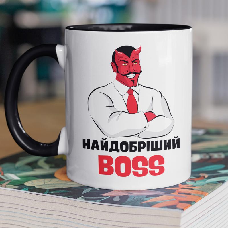 Чашка керамическая с принтом "самый позитивный boss" 330 мл, белая с черной ручкой