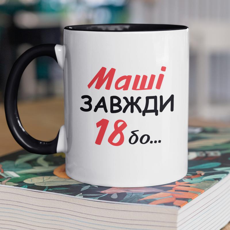 Чашка керамическая с принтом "маши всегда 18" 330 мл, белая с черной ручкой