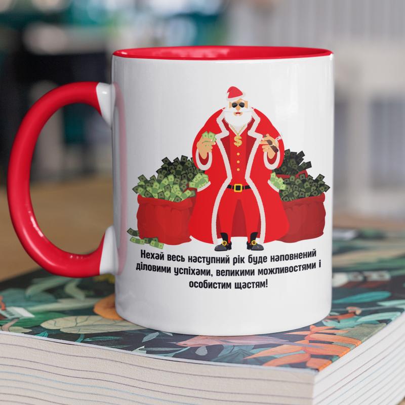 Чашка керамическая с принтом "дед мороз из грошима" 330 мл, белая с красной ручкой