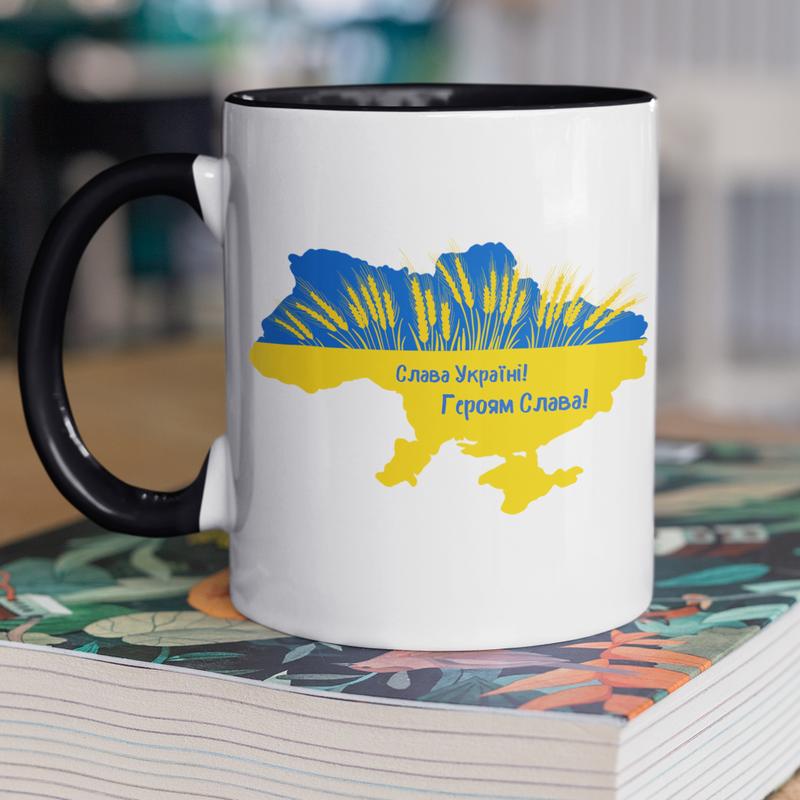 Чашка керамическая с принтом "слава украине" 330 мл, белая с черной ручкой