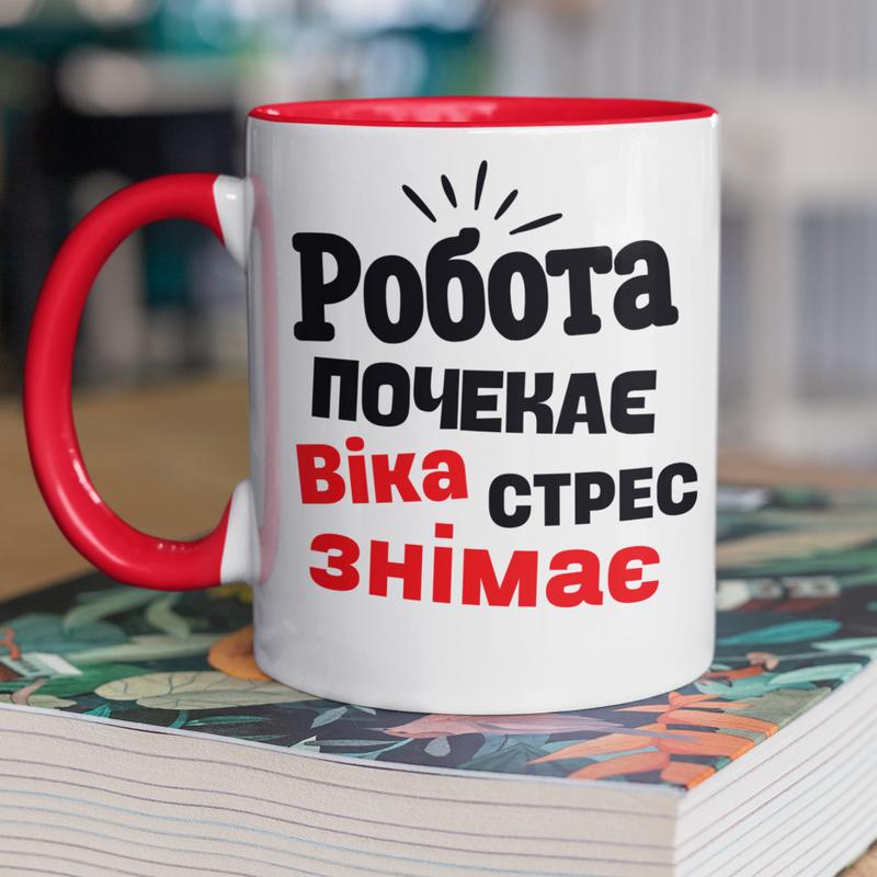 Чашка керамическая с принтом "вика стресс снимает" 330 мл, белая с красной ручкой