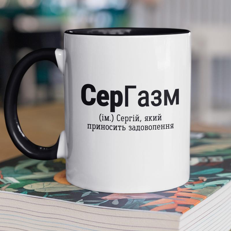 Чашка керамическая с принтом "сергазм" 330 мл, белая с черной ручкой