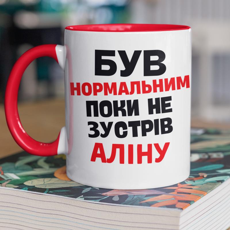 Чашка керамічна з принтом "був нормальним поки не зустрів аліну" 330 мл, біла з червоною р...