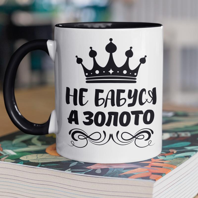 Чашка керамічна з принтом "не бабуся а золото" 330 мл, біла з чорною ручкою
