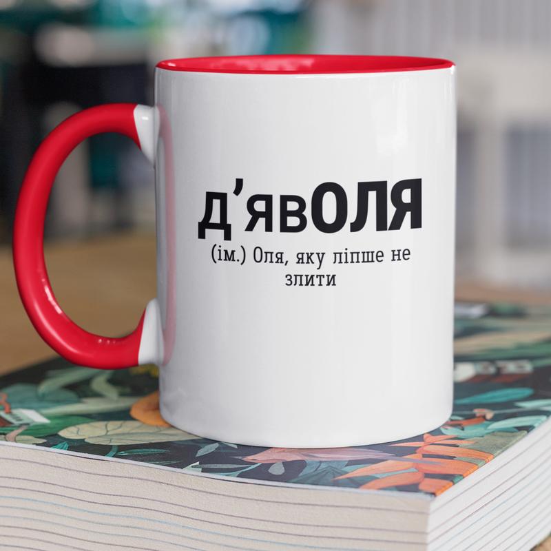 Чашка керамическая с принтом "дяволя" 330 мл, белая с красной ручкой