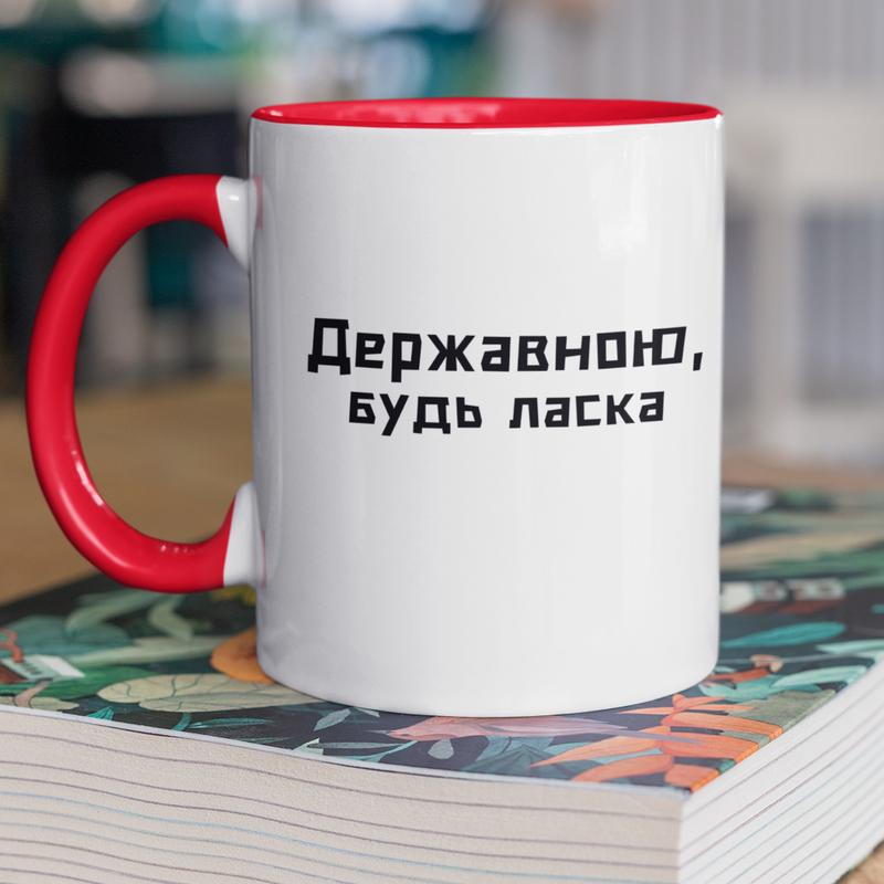 Чашка керамическая с принтом "державеющей пожалуйста" 330 мл, белая с красной ручкой