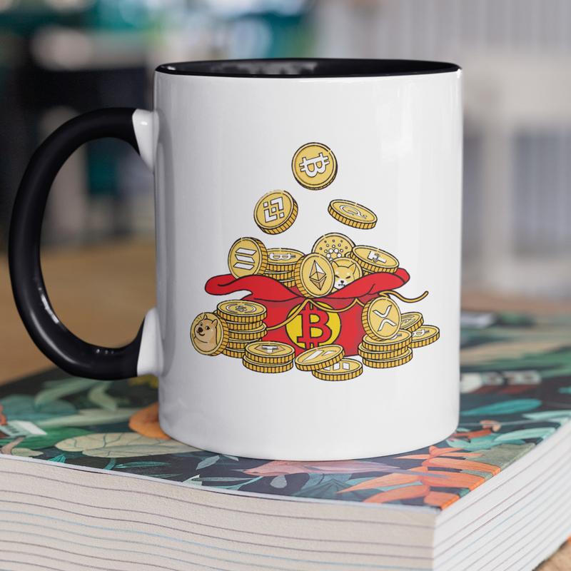 Чашка керамическая с принтом "криптовалюта" 330 мл, белая с черной ручкой