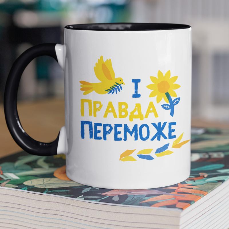 Чашка керамическая с принтом "и правда победит" 330 мл, белая с черной ручкой