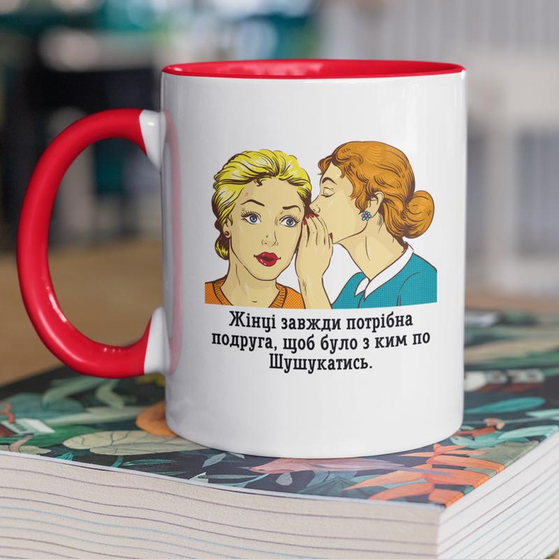Чашка керамическая с принтом "жинцы всегда нужна подруга" 330 мл, белая с красной ручкой