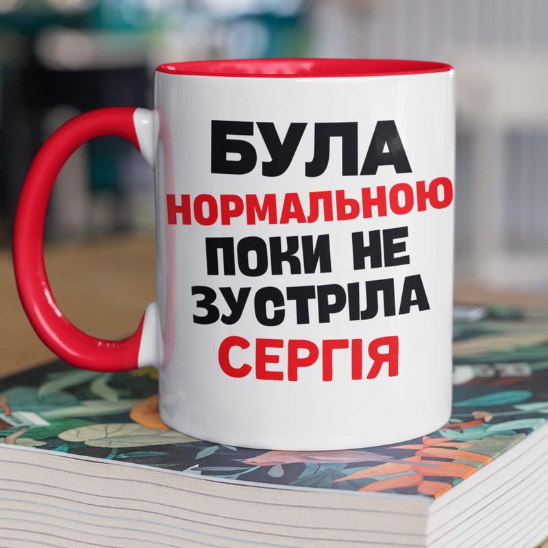 Чашка керамическая с принтом "була нормальной пока не навстречу сергею" 330 мл, белая с кр...