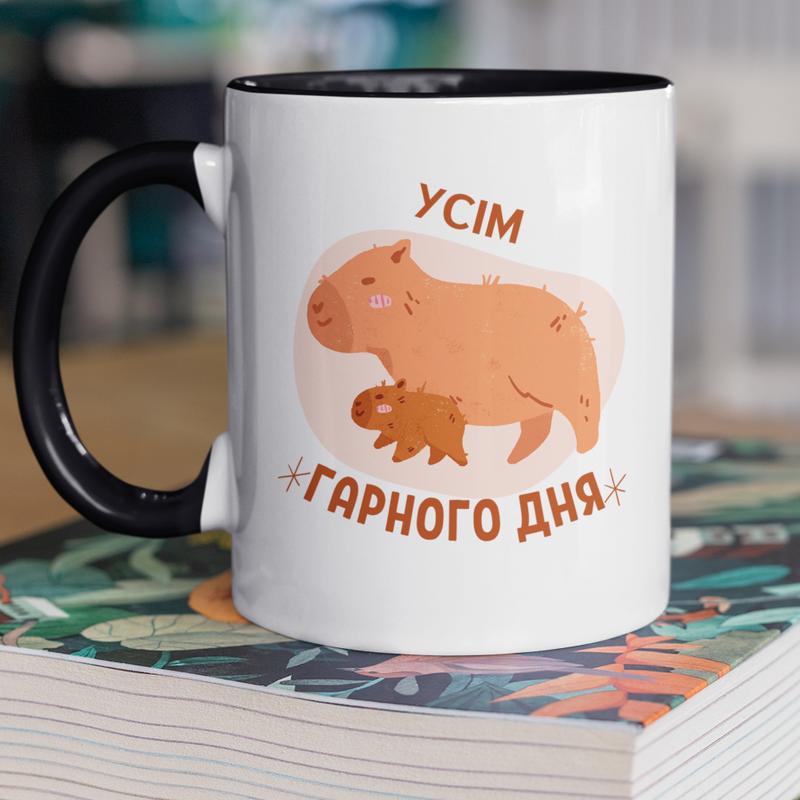 Чашка керамічна з принтом "усім гарного дня" 330 мл, біла з чорною ручкою