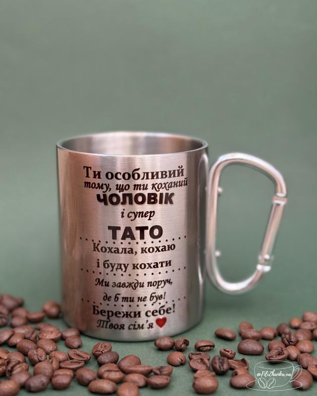 Металева чашка з карабіном⛓️ 💸Ціна: 380 грн (стандартне пакування) 💸Ціна: 405 грн (подарункове пакування🎁) Обʼєм: 300 мл 🇺🇦 Власне виробництво 🇺🇦 🖨️Можливий друк з вашими фото та текстом (розробка макету безкоштовна) 🚀Миттєве виготовлення та швидка відправка 🚚Відправка Новою Поштою/Укрпоштою