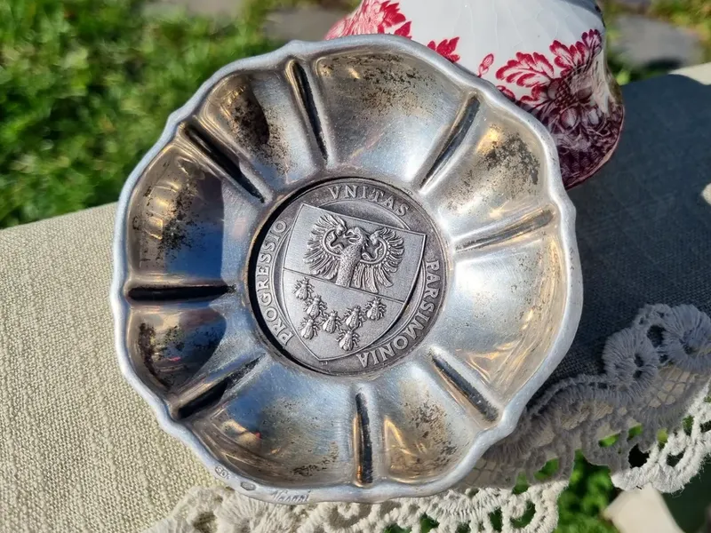 Серебряный кубик с барельефным изображением, геральдика. Италия. На чаше изображен герб, а по кругу выгравированы слова на латыни: PROGRESSIO (Прогресс), UNITAS (Единство) и PARSIMONIA (Бережлисвость). Подобные изделия были распространены в континентальной Европе XIX и начале XX веков. Есть 800 проба. Вес- 73 грамма. Прекрасное состояние.