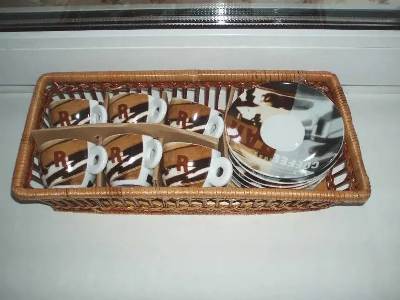 6 фарфоровых пар для эспрессо в соломенной корзинке. Производство Китай. Объём чашечки 60 мл, высота 4 см, диаметр 6 см. Диаметр блюдца 11.5 см. Размер корзинки 32.5 х 15 х 7.5 см. Набор новый, в использовании не был. Пересылку оплачивает покупатель.