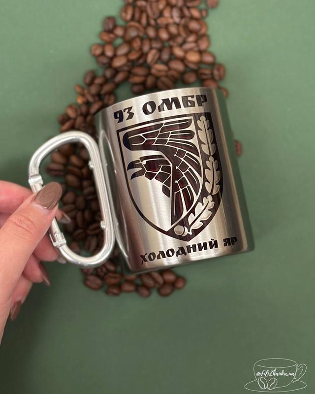 Металева чашка з карабіном⛓️ 💸Ціна: 380 грн (стандартне пакування) 💸Ціна: 405 грн (подарункове пакування🎁) Обʼєм: 300 мл 🇺🇦 Власне виробництво 🇺🇦 🖨️Можливий друк з вашими фото та текстом (розробка макету безкоштовна) 🚀Миттєве виготовлення та швидка відправка 🚚Відправка Новою Поштою/Укрпоштою