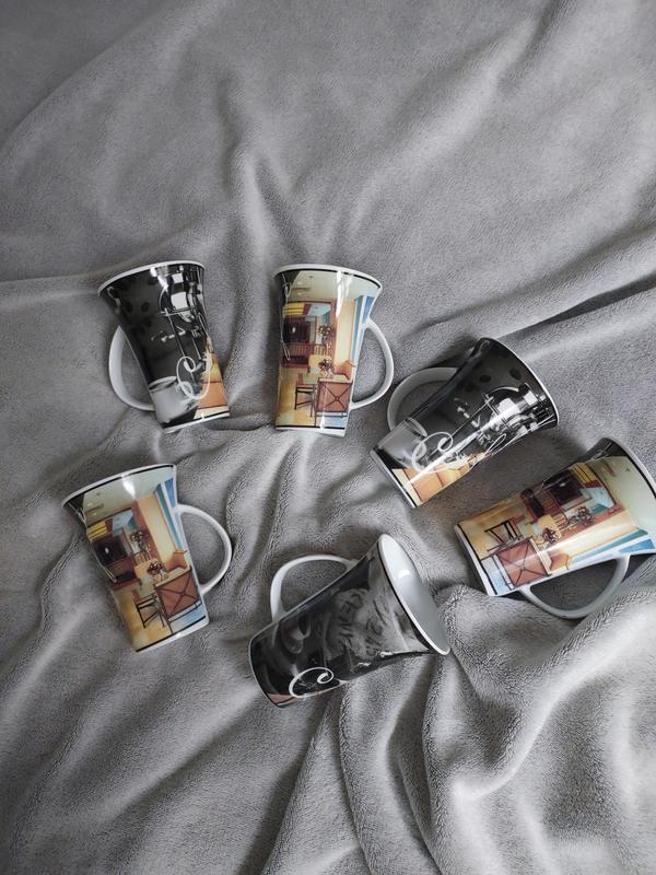 6 красивых чашек с интересным дизайном. Каждая имеет ЧБ-страну и сторону с цветным дизайном. На ЧБ-стороне-тематика кофе, на цветной-уютный интерьер. Висота чашок 12,3 см. Без дефектов.
