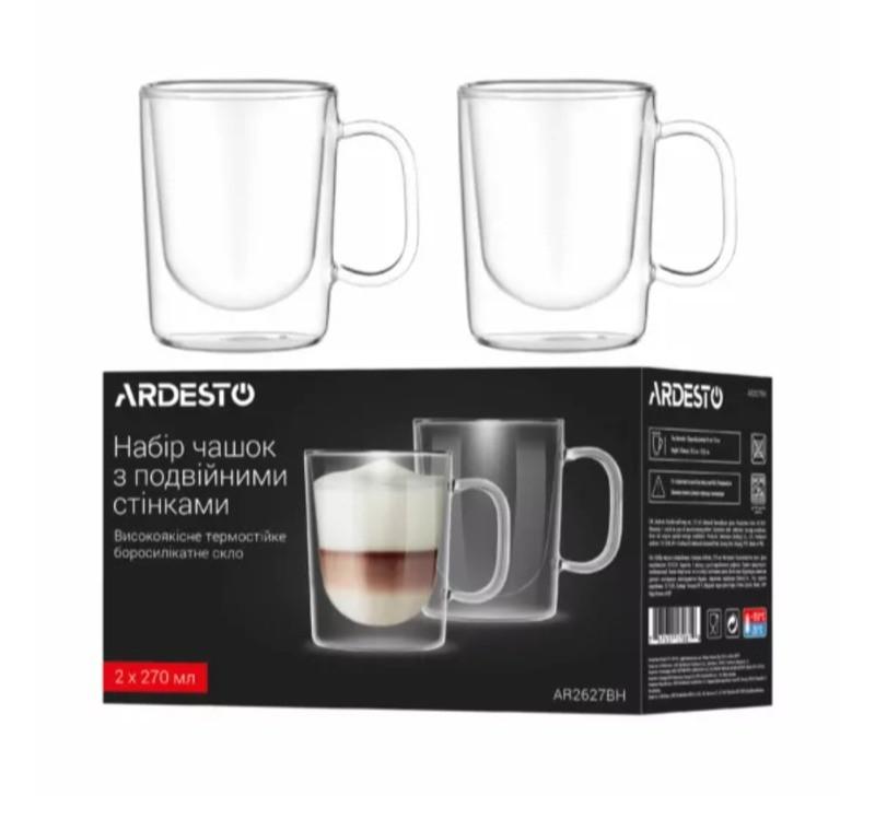 Набор чашек с ручками и двойными стенками ardesto 270 мл 2шт боросиликатное стекло прозрач...