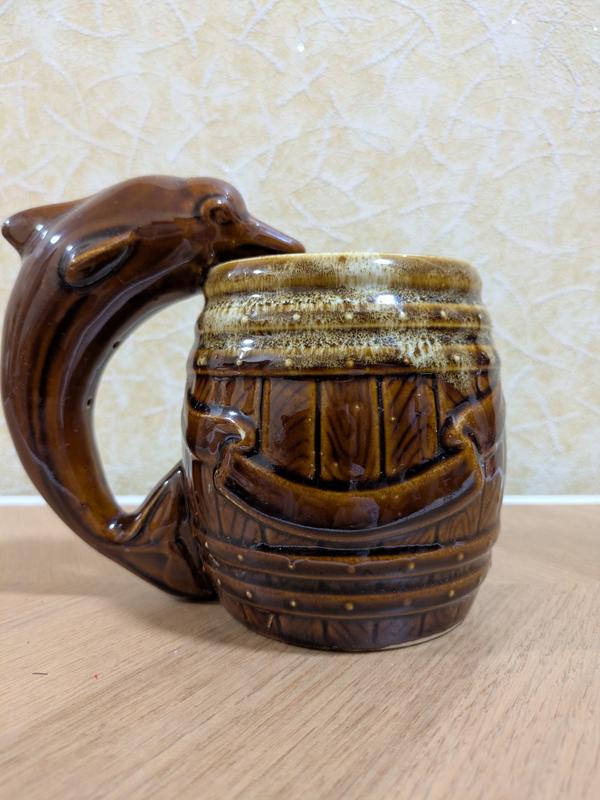 Керамическая пивная кружка с ручкой в виде дельфина Объем 550 мл Высота общая 14,5 см Диаметр верха 8,5 см В идеальном состоянии