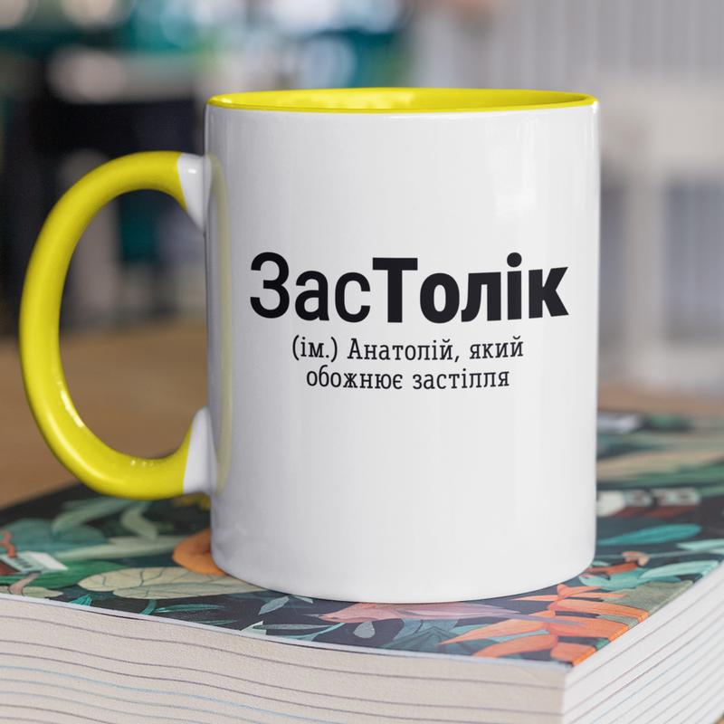 Чашка керамическая с принтом "застолик" 330 мл, белая с желтой ручкой