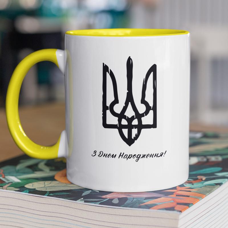 Чашка керамическая с принтом "с днем рождения трезуб" 330 мл, белая с желтой ручкой