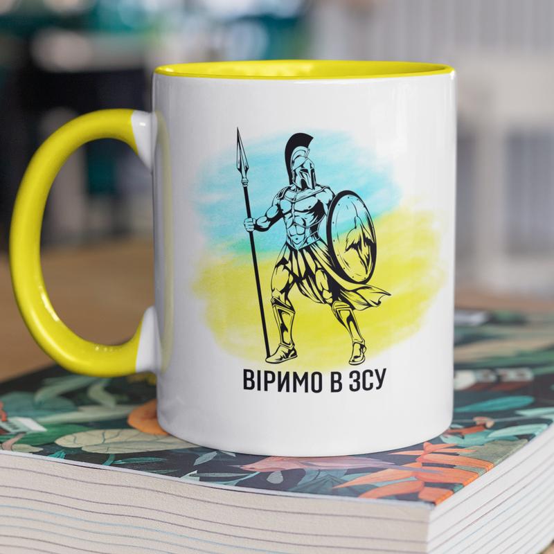 Чашка керамическая с принтом "верим в зсу" 330 мл, белая с желтой ручкой