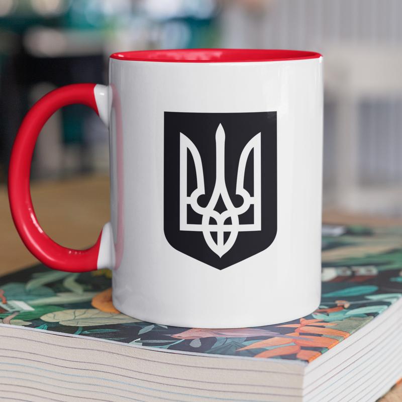 Чашка керамическая с принтом "тризуб" 330 мл, белая с красной ручкой