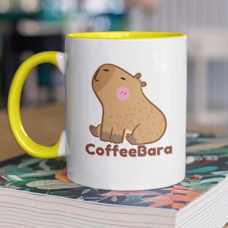 Чашка керамічна з принтом "coffeebara" 330 мл, біла з жовтою ручкою