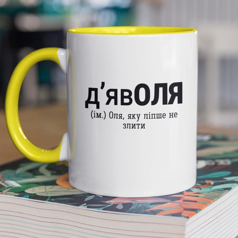 Чашка керамическая с принтом "дяволя" 330 мл, белая с желтой ручкой