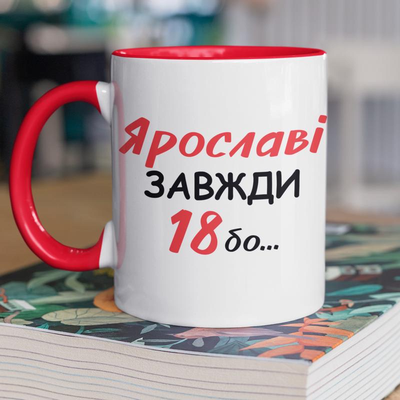 Чашка керамическая с принтом "ярослава всегда 18" 330 мл, белая с красной ручкой