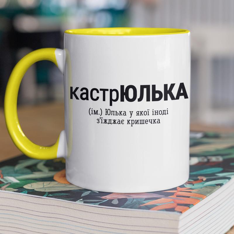Чашка керамическая с принтом "кастрюлька" 330 мл, белая с желтой ручкой