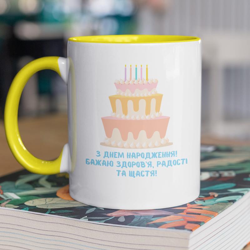 Чашка керамическая с принтом "с днем рождения" 330 мл, белая с желтой ручкой