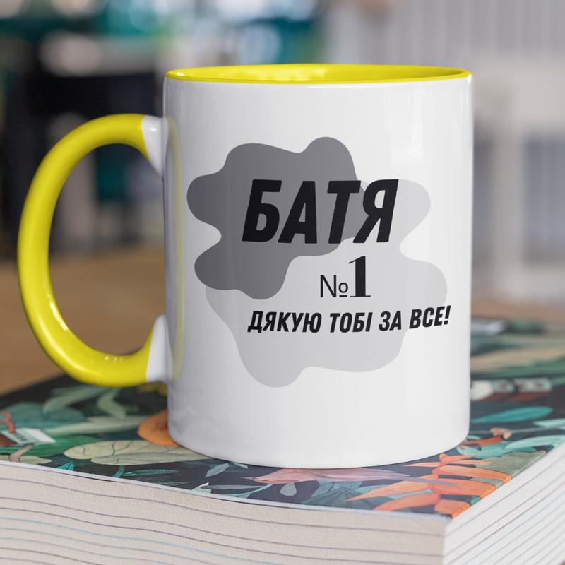 Чашка керамическая с принтом "батя no1 благодарю тебе за все" 330 мл, белая с желтой ручко...